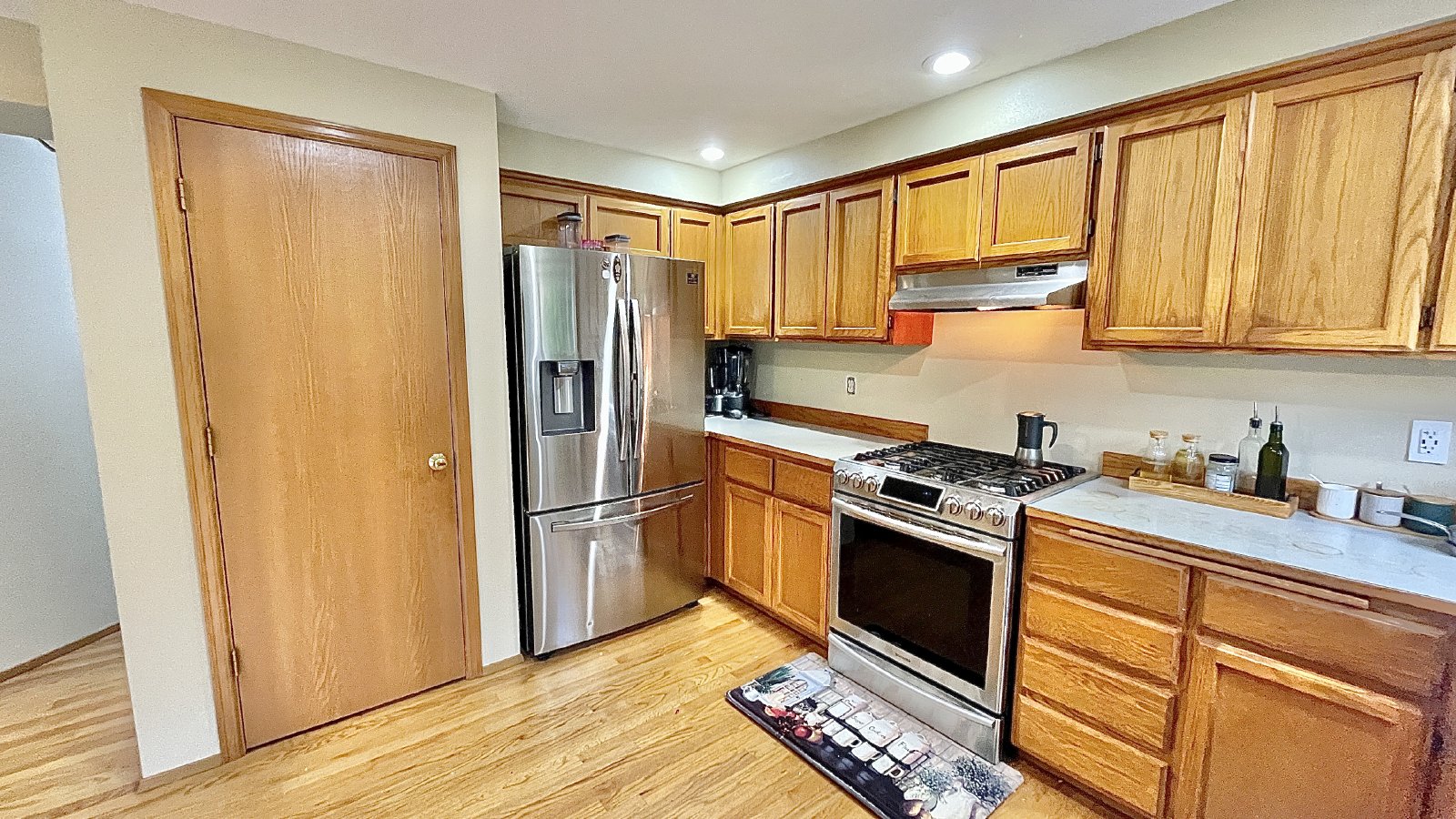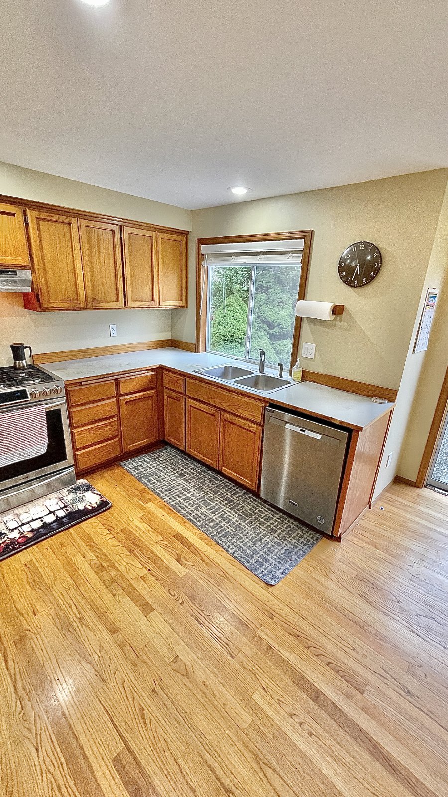 The main living areas flow seamlessly between the family room, dining area, and kitchen, making the space ideal for everyday living or entertaining. The well-equipped kitchen features a gas range, modern appliances, generous cabinetry, and plenty of preparation space. The dishwasher has been recently updated, adding convenience to the kitchen’s functionality. High ceilings in the living room enhance the sense of space, while a skylight brings in additional natural light.